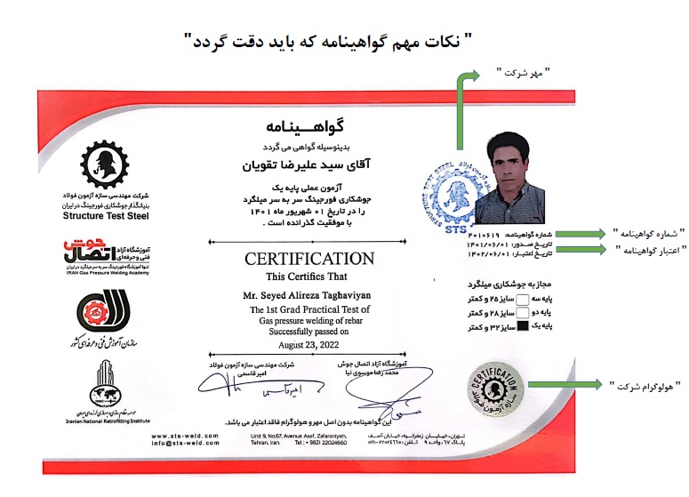 این موارد از شرکت صدور مدرک که شماره آن در گواهینامه درج شده به راحتی قابل استعلام و صحت سنجی می باشد.